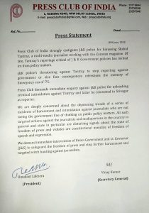 The PCI’s demands came after Shahid Tantray, a journalist working with ‘The Caravan’ magazine accused the police in IIOJK of harassing him over his article on the Army’s interference in activities in Kashmir. The PCI demanded an immediate inquiry against the J&K Police for “unleashing criminal intimidation” against Tantray and the latter be reinstated in Srinagar as a reporter.